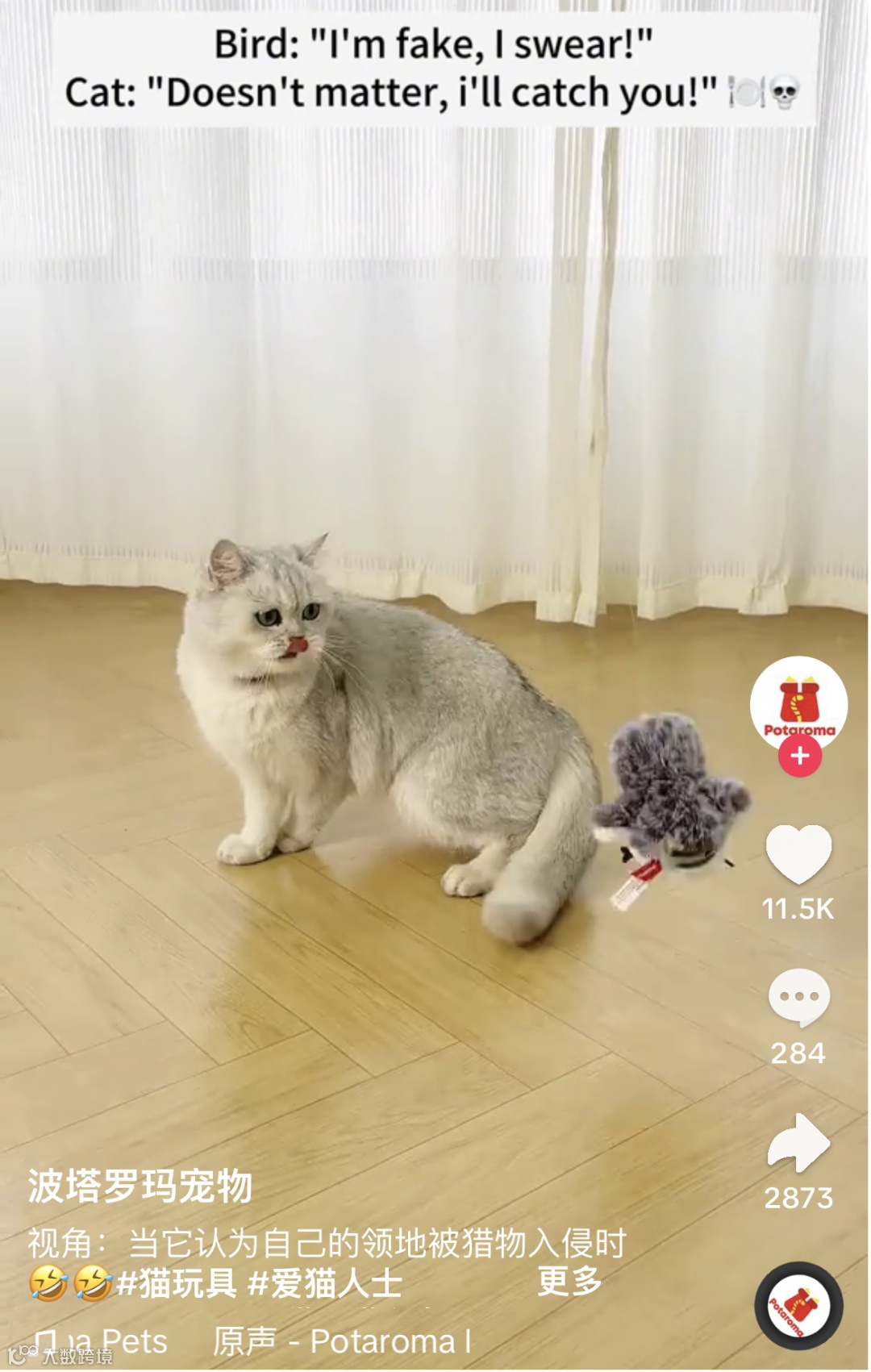 Potaroma在TikTok上广泛合作各类达人,覆盖头部至尾部博主,达人带货贡献过半销售额。更关键的是其自营账号的内容策略——无需复杂脚本,通过真实展示猫咪玩玩具的短视频,即可实现自然爆款。