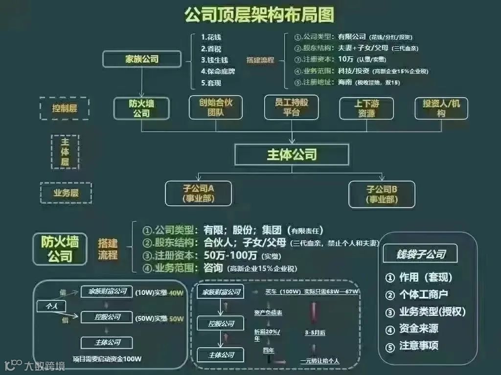 股权架构就好像我们建房子那样,要建多大多高?跟谁一起建?内部结构怎么设计?用什么材料?启用哪个施工队?等等,只有做好周密、安全、有效的计划,才能把房子建得更高更大更结实,以至能传承百年。我们今天先探讨顶层架构这部分内容,它是股权架构中最上层的内容,在以后章节我们通过探讨主体架构、底层架构、架构重组这几个部分,来深入了解股权架构。股权顶层架构设计——五类公司用途。