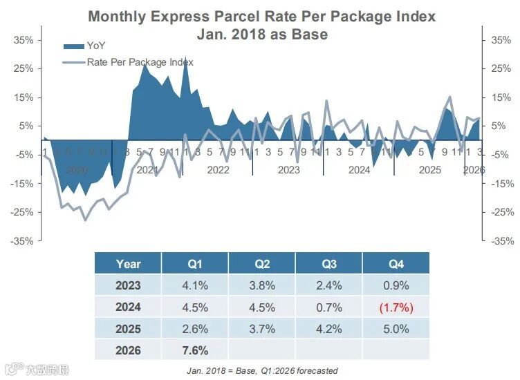 预计2026年快递费率将较2018年1月基线高出7.6%,Q4同比涨幅达5%。