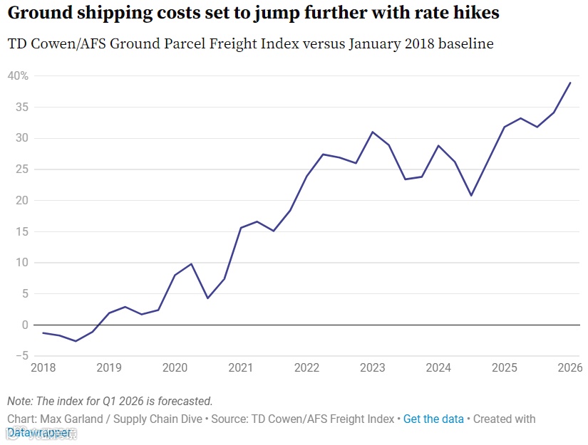 基于对1800多家客户的货运数据分析,AFS Logistics与投资银行TD Cowen联合发布的季度报告显示,2025年第四季度包裹运输费用高于预期的主要原因在于附加费用的大幅增加,且预计2026年运价将继续上涨。