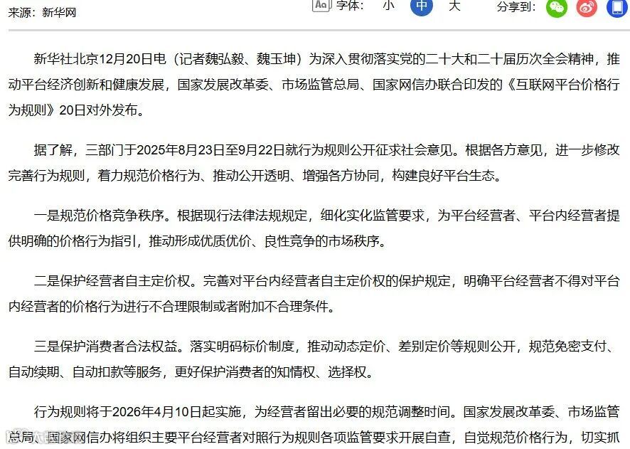 其实核心变化来自于一项即将落地的政策,《互联网价格行为准则》预计将在明今年4月正式生效。