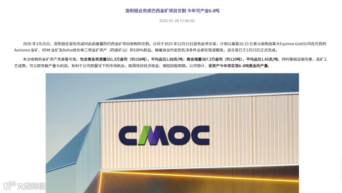 1月25日晚间,洛阳栾川钼业集团股份有限公司宣布已于1月23日完成对巴西金矿项目的收购交割。自2025年12月15日披露收购计划至正式交割,全程仅用时40天,标志着公司正式加码黄金业务板块。