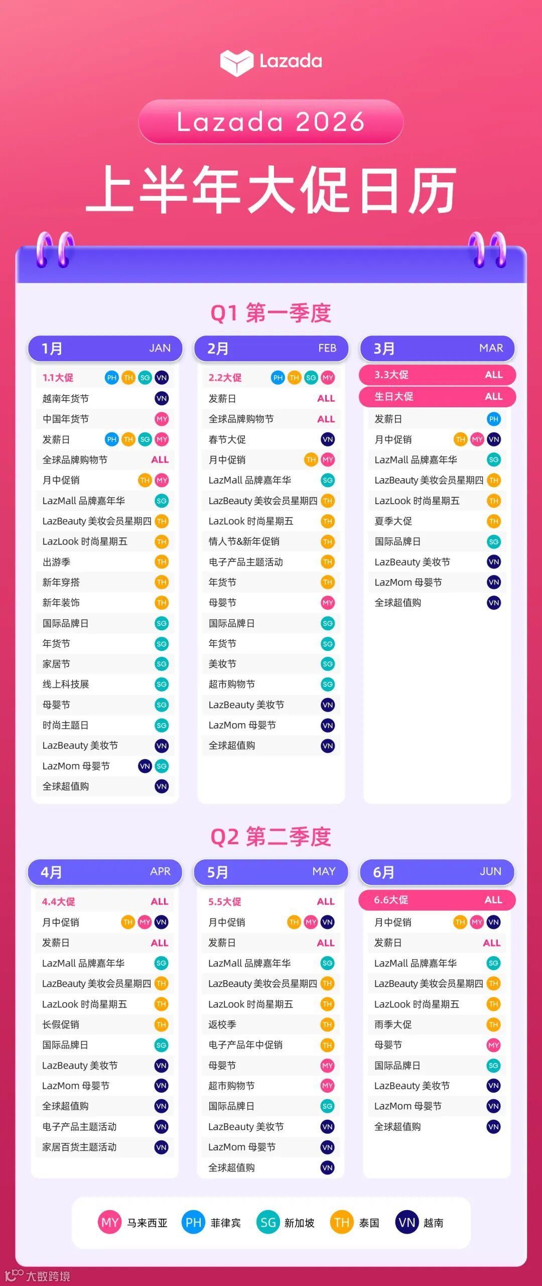 为帮助商家高效规划全年营销节奏,现发布《Lazada 2026上半年大促日历》,全面梳理东南亚五国重点促销节点,助力商家提前部署、抢占市场先机。