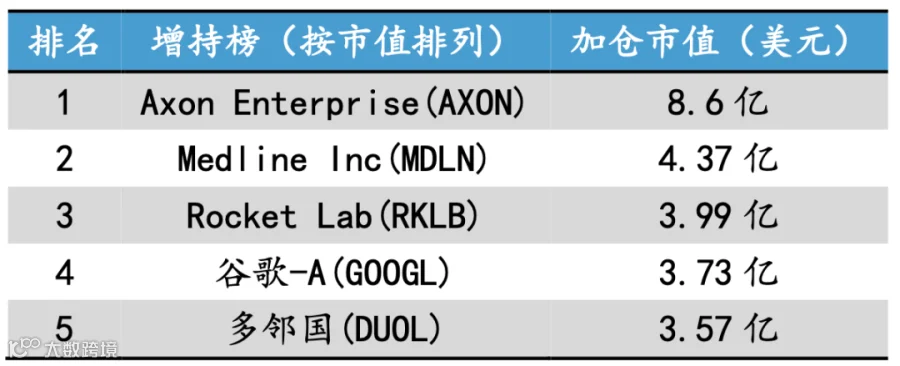柏基大手笔加仓 Axon(警用设备与安全技术⻰头),也增持了教育科技⻰头 多邻国、以及商业航天 RocketLab,可⻅其对垂直科技细分赛道的强烈兴趣。