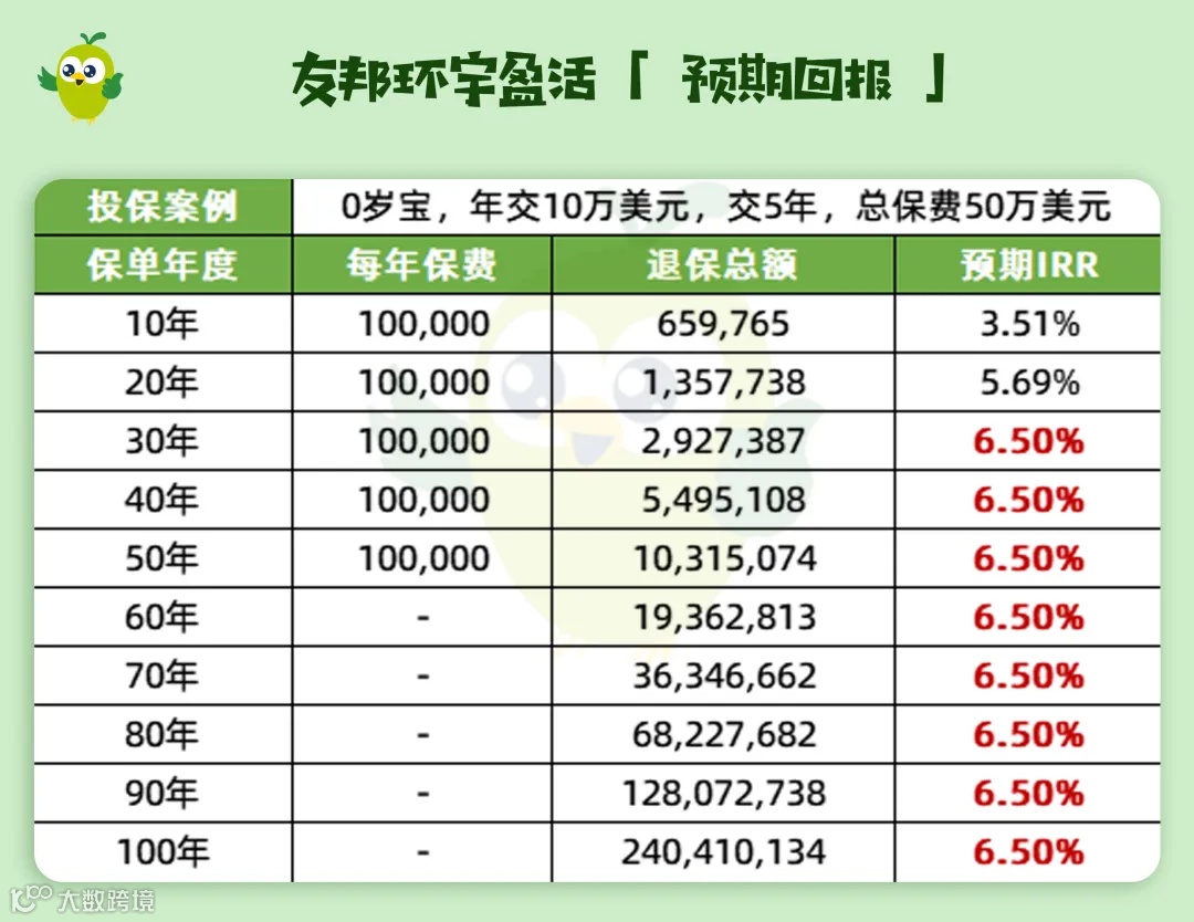 友邦环宇盈活计划兼顾收益性与灵活性,适合长期资产配置。以总保费50万美元、分5年缴付为例: