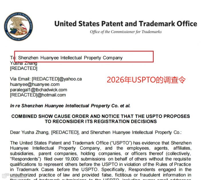 2026年1月27日,美国专利商标局(USPTO)发布“举证令”(Show Cause Order),点名深圳寰逸知识产权有限公司(Shenzhen Huanyee Intellectual Property Co., Ltd.)及其关联方存在大规模商标代理违规行为,要求其在2026年2月26日前提交书面回应。