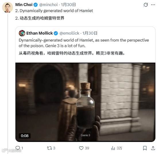 一位AI与AI教育行业的从业者曾发推介绍谷歌新版Gemini3.0的强大功能,并给出了许多“生成游戏画面”的例子,包括把名著《哈姆雷特》改编成游戏画面: