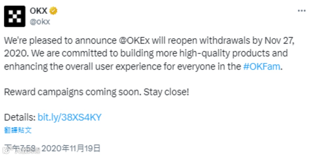 2020年10月,因部分私钥负责人配合公安调查失联,OKX短暂暂停提币服务,引发市场波动,平台币OKB与比特币价格应声下跌。外界猜测事件或涉及洗钱调查。一个月后(11月26日),相关人员恢复履职,提币功能全面重启。尽管期间大量资产被提出,但未造成平台倒闭或刑事追责,系统稳定性得以恢复。