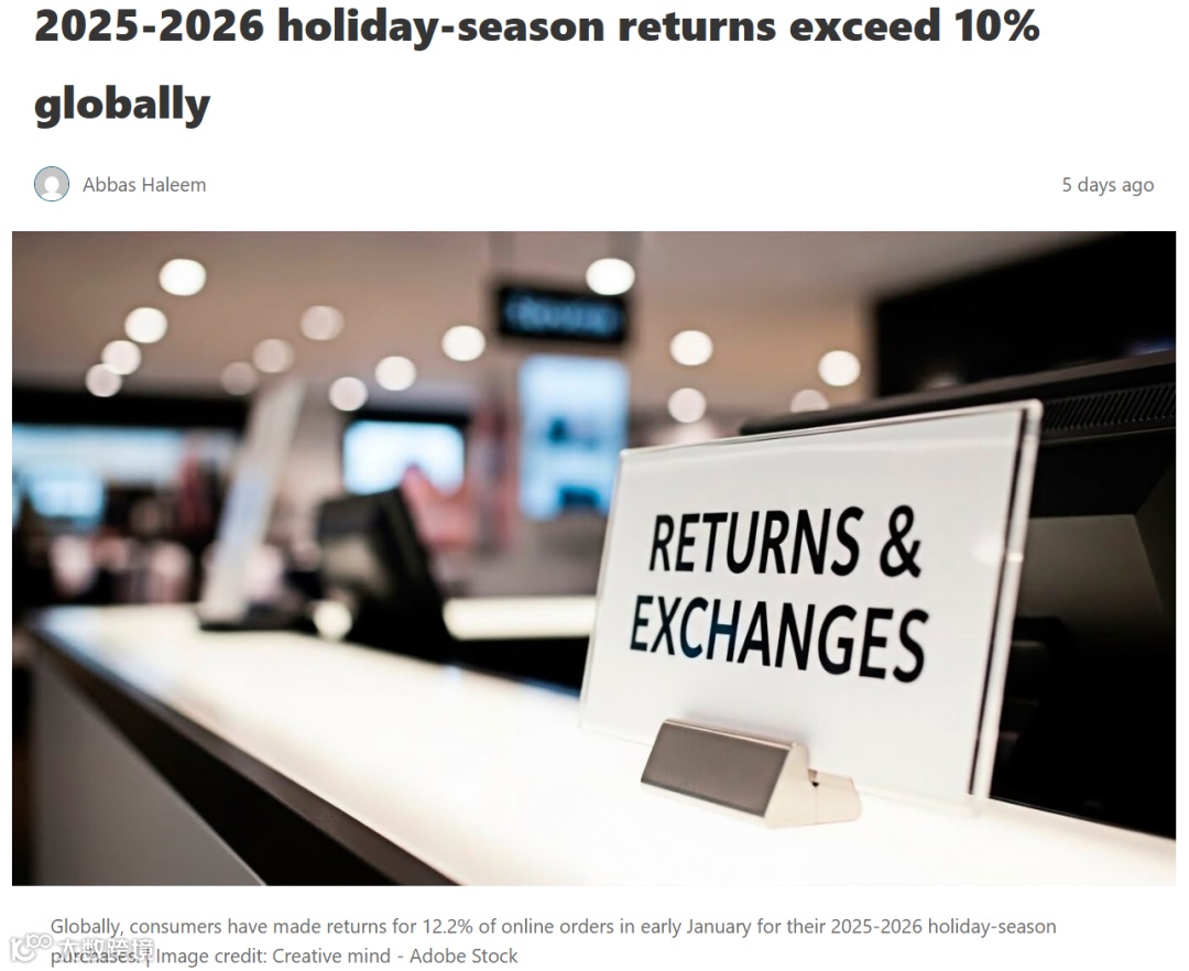 Salesforce数据显示:2026年1月1日—14日,全球线上订单退货率达12.2%,同比上升3%;2025年11—12月假日季,退货金额高达1810亿美元,占同期线上消费总额的14%,同比激增10%。