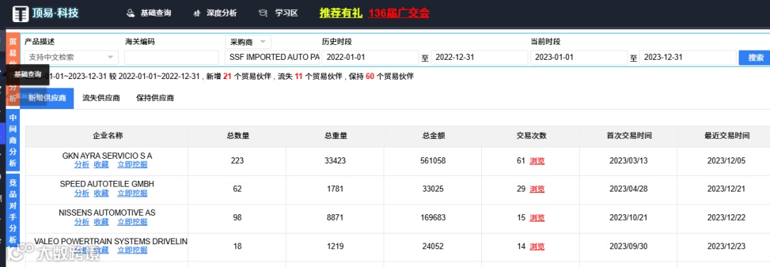 利用深度报表分析,还可以更详细的看到准客户的供应商动态,了解采购商详细需求以及购买率