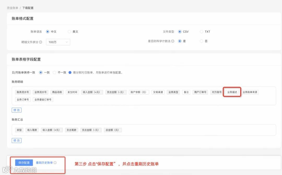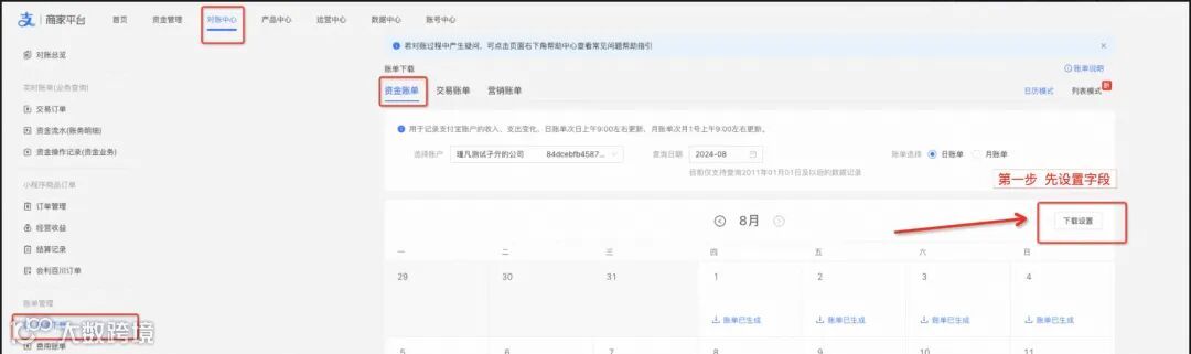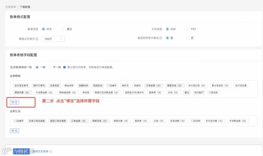账单下载之前,需要配置对账所需的必须字段(建议配置字段:备注、商户订单号、对方账户、业务描述、业务账单来源、业务订单号、业务基础订单号);详细配置路径如下: