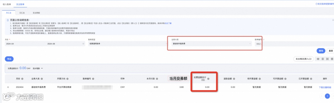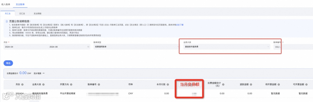 查看路径2:千牛工作台-财务-收支账单-支出账单页面-月汇总,业务大类搜索【基础软件服务费】即可下载对应的扣费明细(账单更新时间:月账单次月10号左右更新)