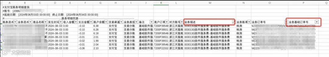 配置完成后,修改完后记得保存配置,并重刷历史账单,重刷后次日18点后可下载查看。如果您本身字段配置没问题,您可以直接下载账单查看。业务描述为:【 0030130|软件服务费-基础软件服务费 】即为基础软件服务费对应的扣费明细