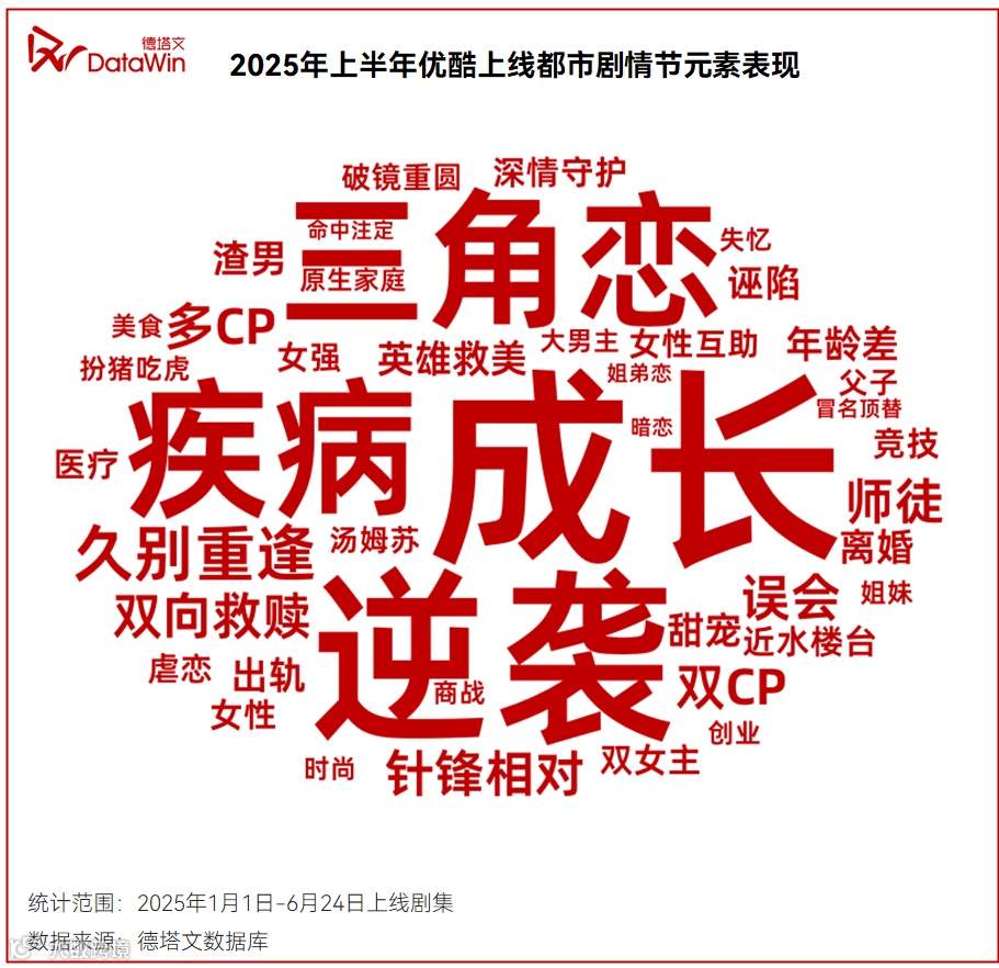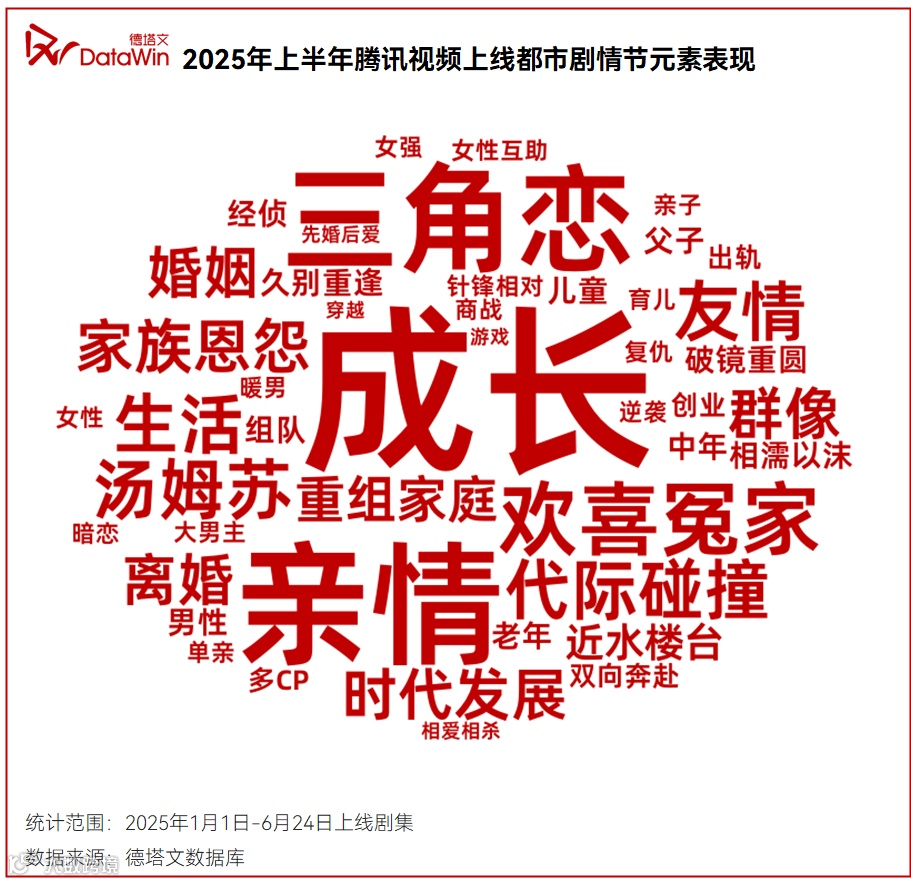 都市剧情感趋向“柔情化”,《大河之水》《我的后半生》等聚焦“亲情”“代际冲突”“友情”,强调治愈性情感。重组家庭、相濡以沫等新元素被挖掘。传统“爱情”主线弱化,“大女主”设定减少,励志爽感路线暂被舍弃,现偶题材面临瓶颈。