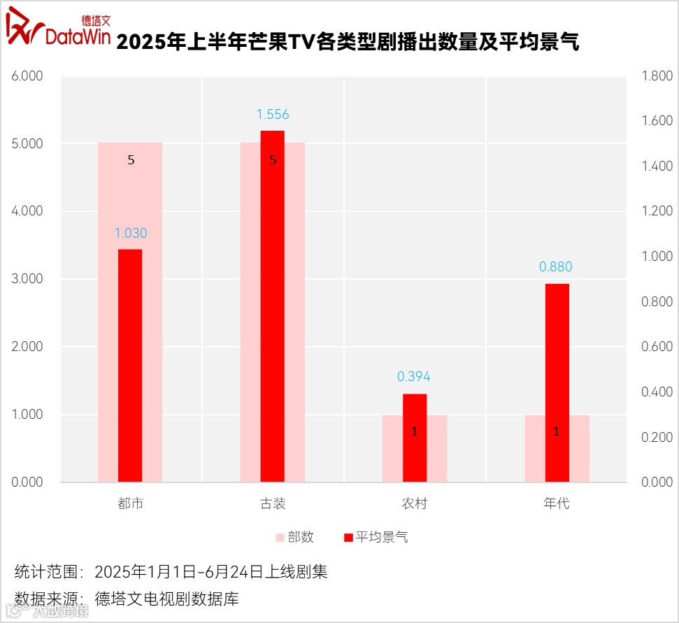 2025上半年,芒果保持稳健,主推都市剧与古装剧。古装剧优势显著,《国色芳华》《五福临门》稳居头部,体现“少而精”策略成效。都市剧无爆款,但《仁心俱乐部》《有你的时光里》等在圈层内获认可,传播有效。