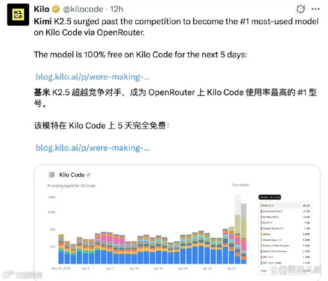 K2.5采用原生多模态架构,支持图文输入、对话与Agent任务,在代码生成、图像理解、视频处理等通用智能任务中表现领先。在Openrouter平台上,K2.5排名升至第三,仅次于Claude Sonnet 4.5和Gemini 3 Flash。