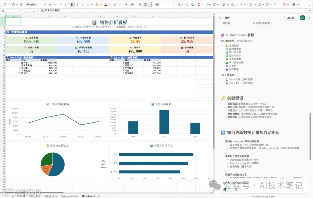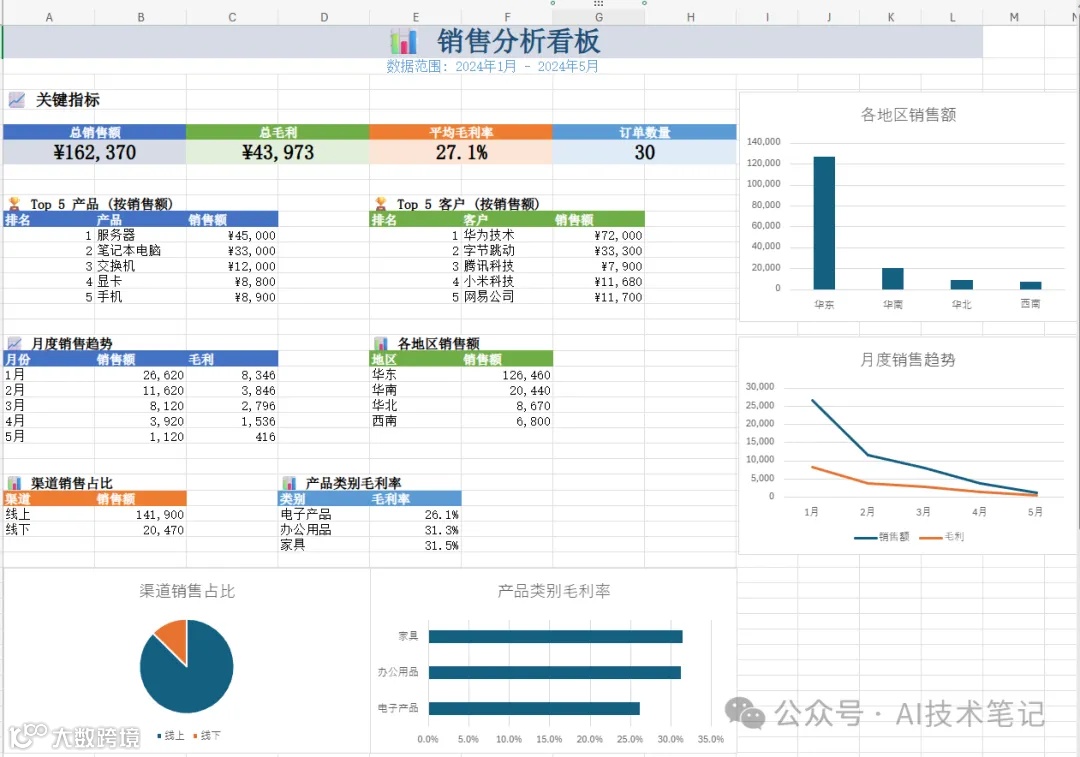 输出一个“Dashboard”工作表,将上述关键指标(本月销售额、环比、毛利率、Top 5 产品/客户)和图表排版成一页可汇报的看板,格式清晰、对齐美观,并加上标题与日期范围。