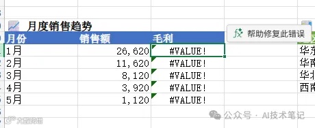 当透视表出现错误时,点击异常单元格右上角「帮助修复此错误」按钮,Copilot将自动诊断原因、提供修正公式并一键修复。