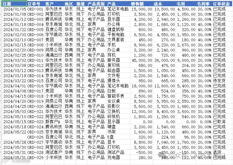 新建或整理一张明细表(命名为“Sales_Raw”),字段包含:日期、订单号、客户、地区、渠道、产品类别、产品、销售额、成本、毛利、毛利率、订单状态。若缺少字段,请新增并给出合理的默认/空值处理方式。