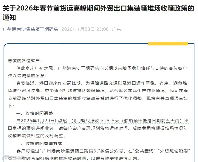 距离春节仅剩两周左右,工厂陆续放假,实际可出货时间不足一周。广州南沙集装箱三期码头于1月29日0时起实施新规:仅接受船期到港前5天(ETA-5)内的出口重柜预约进闸,通知发布后52分钟即生效。此举旨在缓解堆场饱和、港区拥堵及排队压力,但实际执行强度远超常规操作节奏。