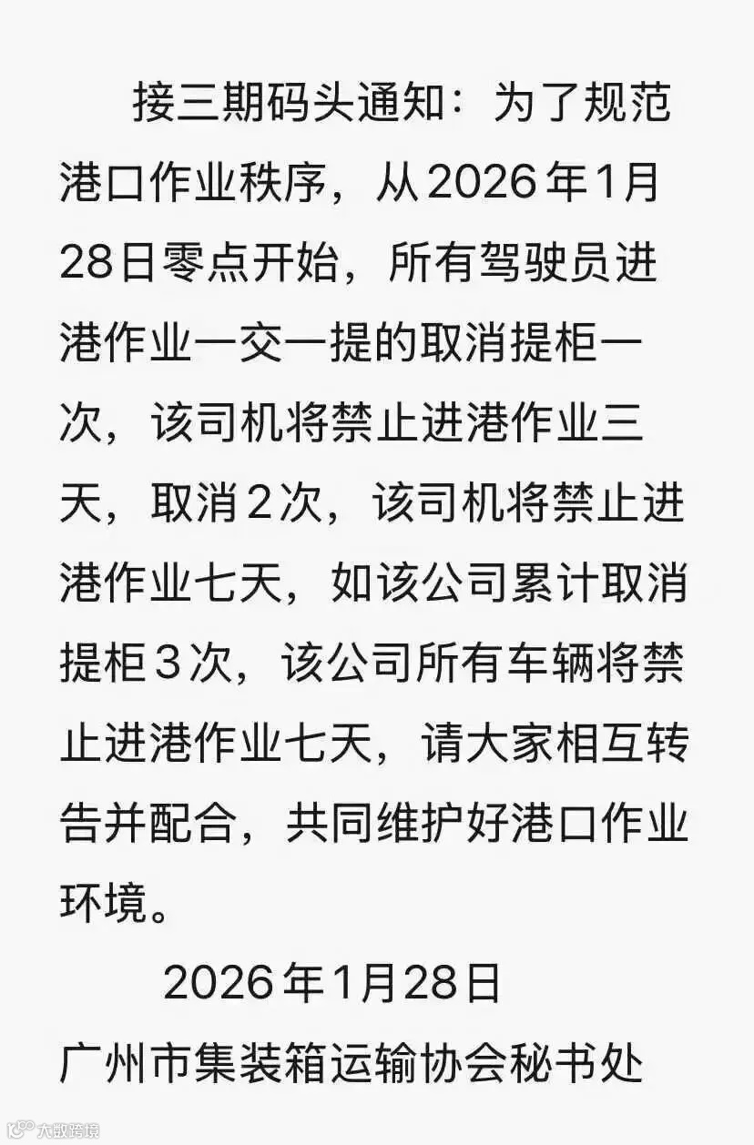 - 司机单次取消进/提柜预约,禁入码头3天;