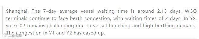 上海港当前平均等泊时间约为2.13天。外高桥港区(WGQ)仍存在泊位紧张,等待时间约2天。洋山港区(YS)受船舶集中到港影响,第02周作业压力较大,但一期、二期(Y1、Y2)拥堵已有所缓解,运行效率提升。