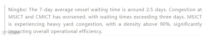 宁波港船舶待泊时间上升,近7天平均等泊约2.5天。梅山国际集装箱码头(MSICT)和穿山集装箱码头(CMICT)拥堵加剧,等待时间均已超3天。MSICT堆场密度超过90%,处于高度饱和状态,严重影响作业效率。