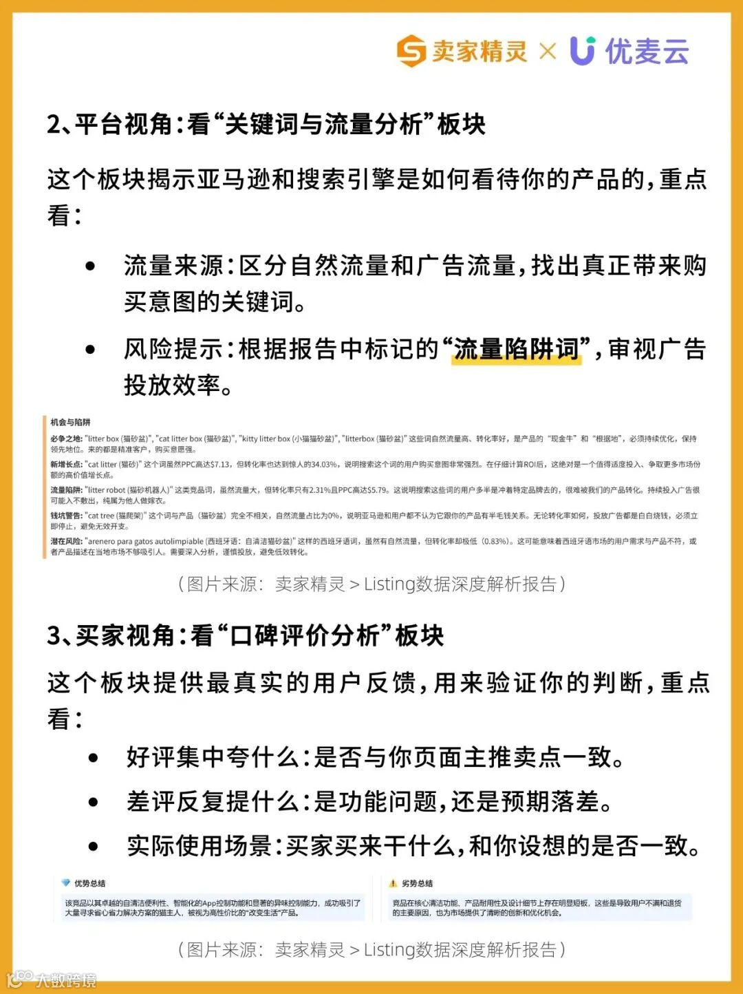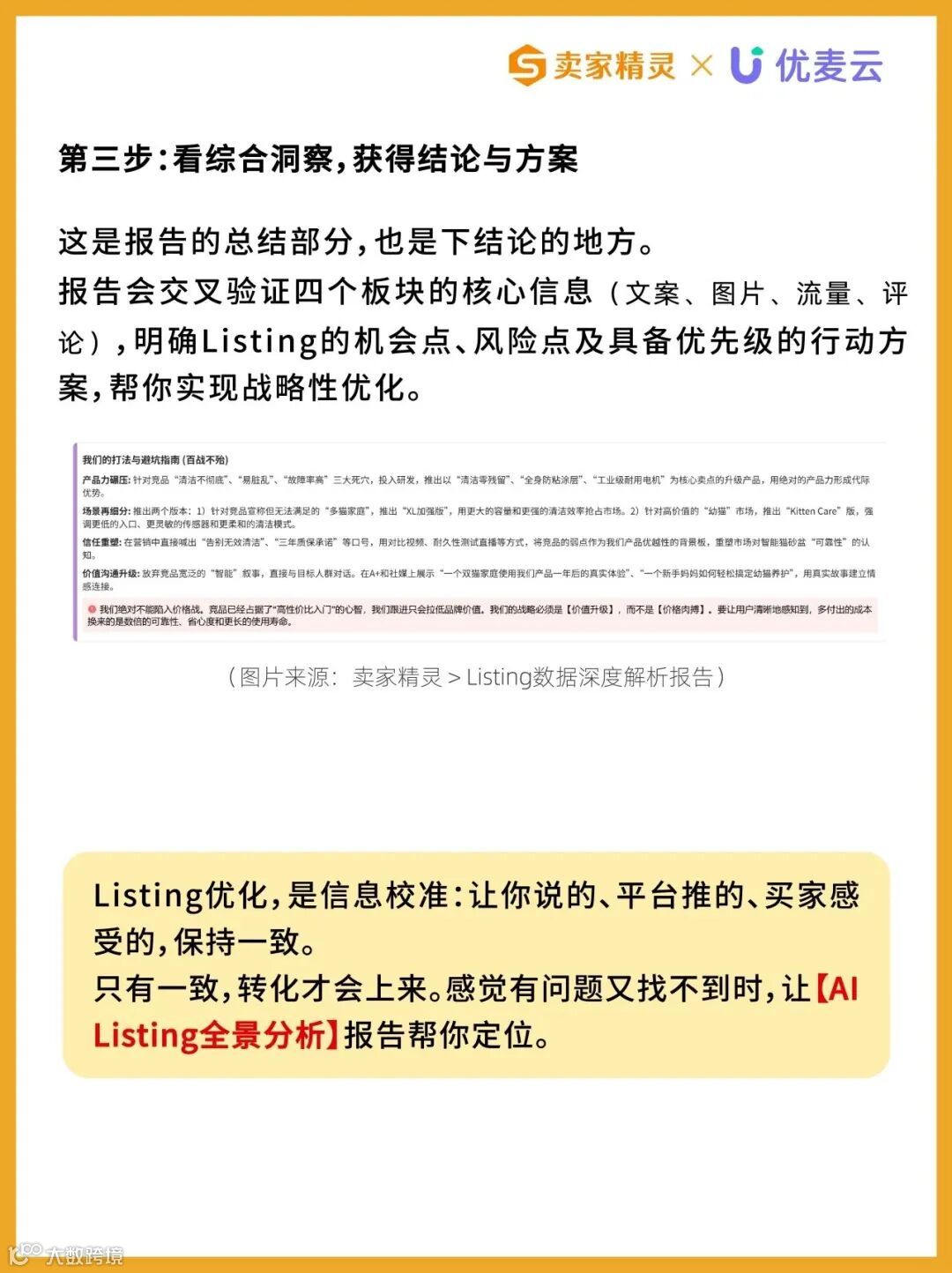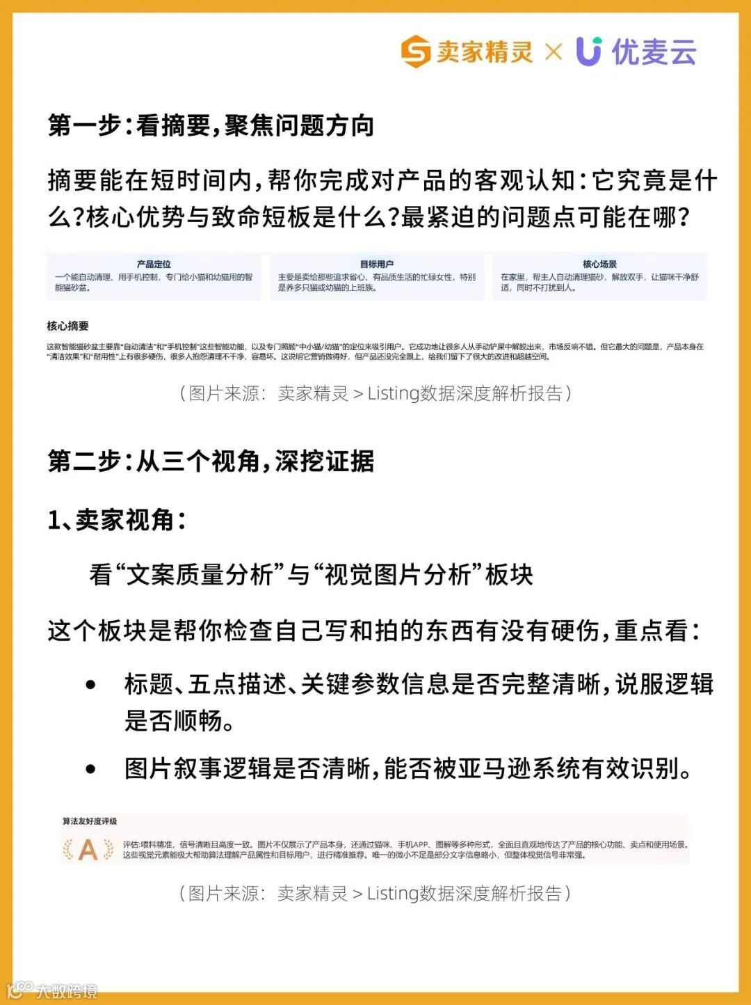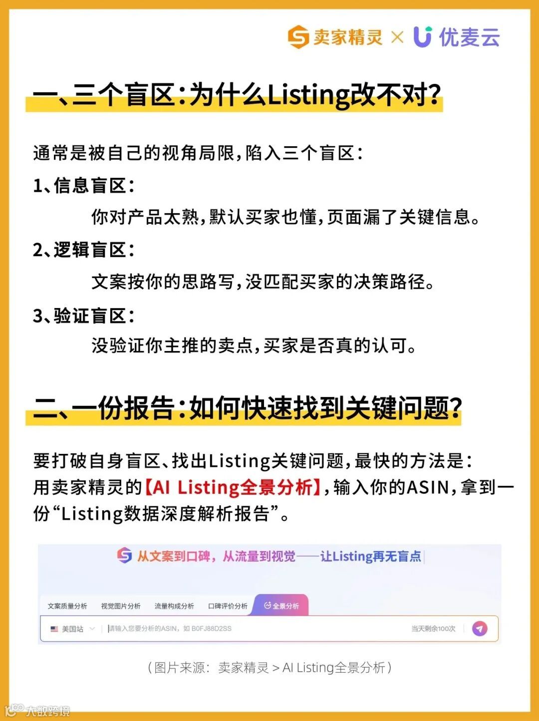 优化亚马逊Listing不能仅凭经验或感觉,需从卖家、平台、买家三方视角系统诊断。当前,卖家精灵推出“AI-Listing全景分析”功能,帮助卖家快速识别标题、图片、五点描述、A+内容、关键词布局等核心模块的潜在问题。