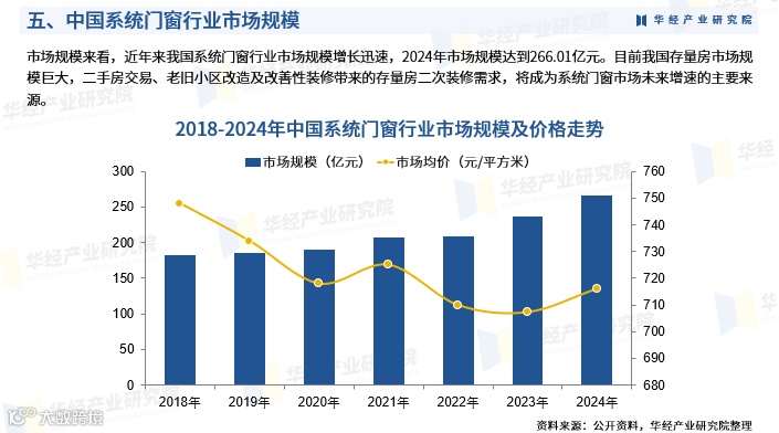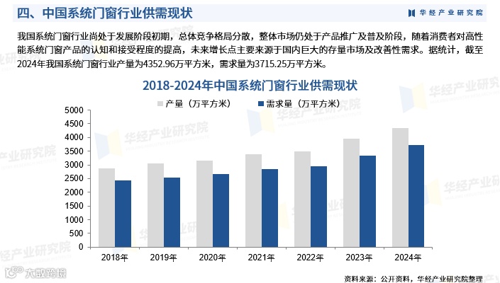 我国系统门窗行业尚处发展初期,市场竞争格局分散,整体仍处于产品推广与普及阶段。随着消费者对高性能门窗认知度提升,未来增长将主要来自庞大的存量房市场及改善型住房需求。2024年,我国系统门窗产量为4352.96万平方米,需求量为3715.25万平方米,市场规模达266.01亿元。