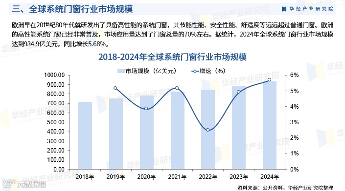 欧洲自20世纪80年代起已广泛研发和应用高性能系统门窗,其节能性、安全性和舒适度显著优于普通门窗,市场普及率已达70%左右。2024年全球系统门窗市场规模达934.9亿美元,同比增长5.68%。