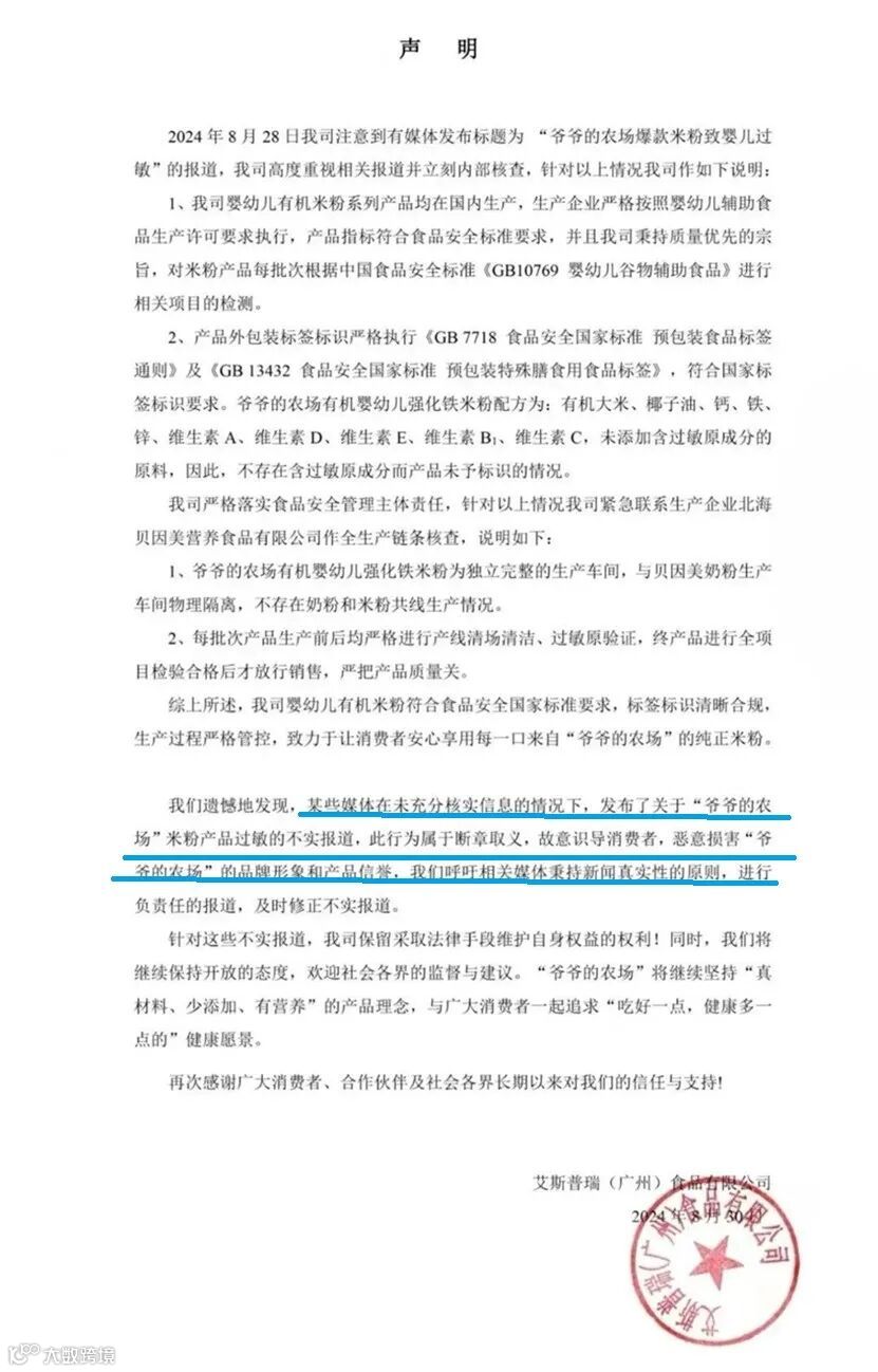 爷爷的农场则回应称公司紧急联系生产企业北海贝因美营养食品有限公司作全生产链条核查,不存在奶粉和米粉共线生产情况。