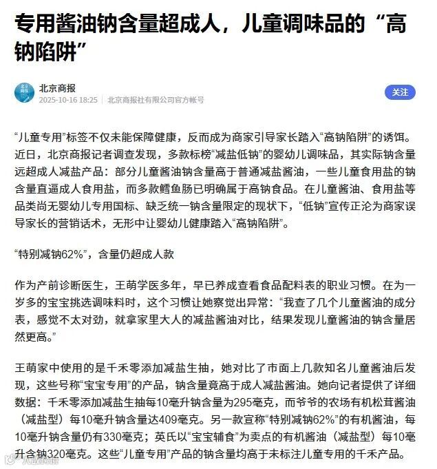 2025年10月,《北京商报》报道称,爷爷的农场旗下有机松茸酱油(减盐型)每10毫升钠含量达409毫克,实际钠含量高于某品牌成人款零添加减盐生抽;公司出品的DHA高蛋白鳕鱼肠,每100g钠含量则高达774毫克。