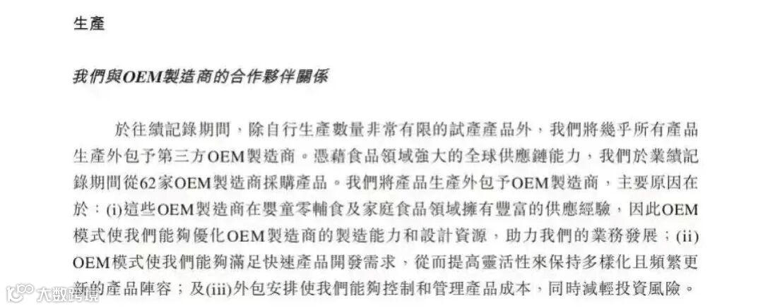 根据招股书描述,爷爷的农场采取全球化采购与本土化生产相结合的模式,但生产环节几乎完全依赖于国内代工厂。