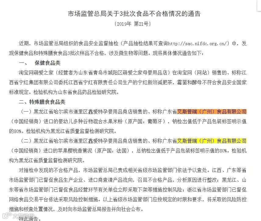 自爷爷的农场产品上市销售以来,其多次被各级监管部门检出不合格。2019年6月,其婴幼儿米粉和果泥因钠、碘含量低于产品标签明示值的80%,被国家市场监管总局通报;2020年,其中国经销商艾斯普瑞(广州)食品有限公司因2批次米粉不合格,被罚没29万元;2021年4月,海关总署进一步通报,爷爷的农场一批次进口自比利时的婴幼儿大米粉因钙含量不符合国家标准要求被拒绝入境。