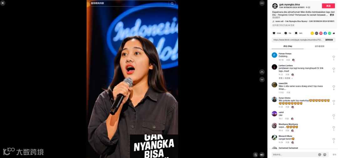 这段AI视频展示了一个看起来像Nike Ardila的女孩演唱经典歌曲《Duri Terlindung》。这场表演让评委们激动不已,甚至感动落泪,因为氛围非常真实。在最后重要提示了,此视频完全为虚构。视频时长20s,在2025年8月30日发布,截至目前已获得1710.00万次的播放量和23.88万的点赞,数据非常的亮眼。