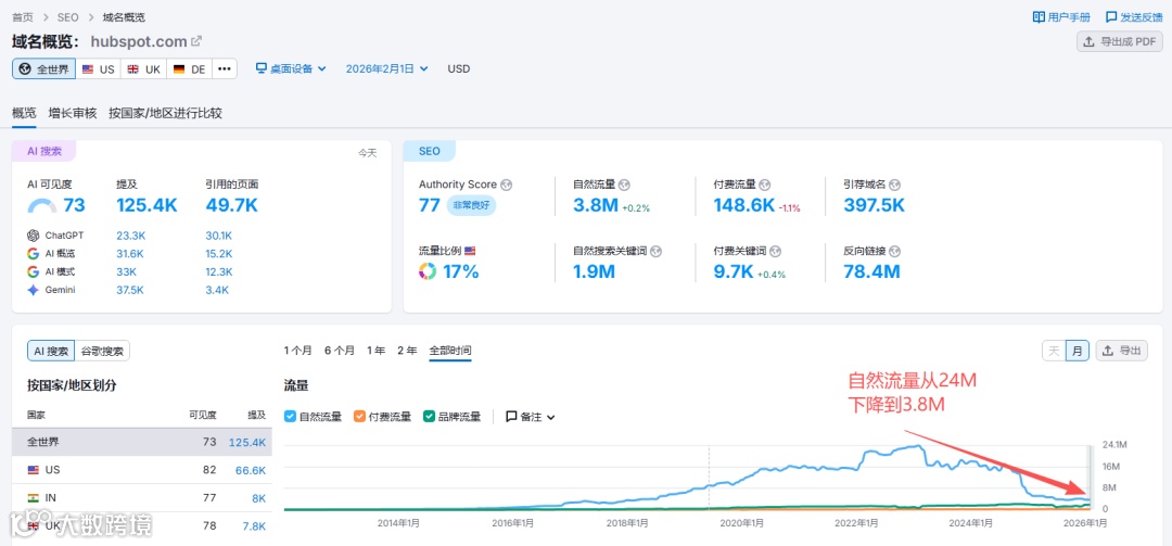 这些因素共同作用,使得 HubSpot 在过去两年里自然搜索流量显著下降。