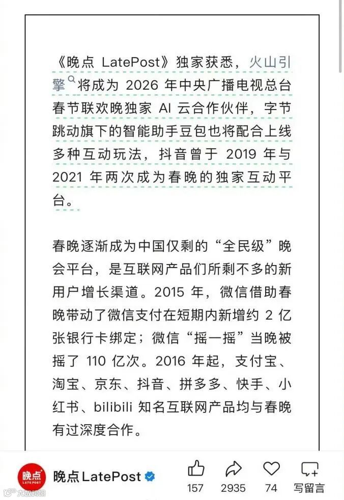 回溯2015年以来的春晚互联网合作史,不难发现一条清晰的行业热点变迁轨迹。从移动支付的崛起、短视频的鼎盛,到如今AI技术的全民普及,每一个互联网风口都能在春晚这个超级IP上找到投射。2015年,微信以“摇一摇抢红包”联动春晚,除夕当日互动总量达110亿次,直接推动微信钱包绑卡用户突破2亿,这一战被马云称为“珍珠港偷袭计划”,也奠定了微信在移动支付领域的地位。随后支付宝“集五福”、淘宝亿元红包接力登场,再到抖音开启短视频互动时代,春晚早已成为互联网产品破圈的“试金石”。如今豆包携AI技术站上这个舞台,能否复刻微信支付的传奇,成为行业最大悬念。