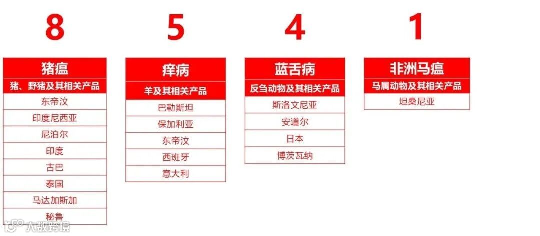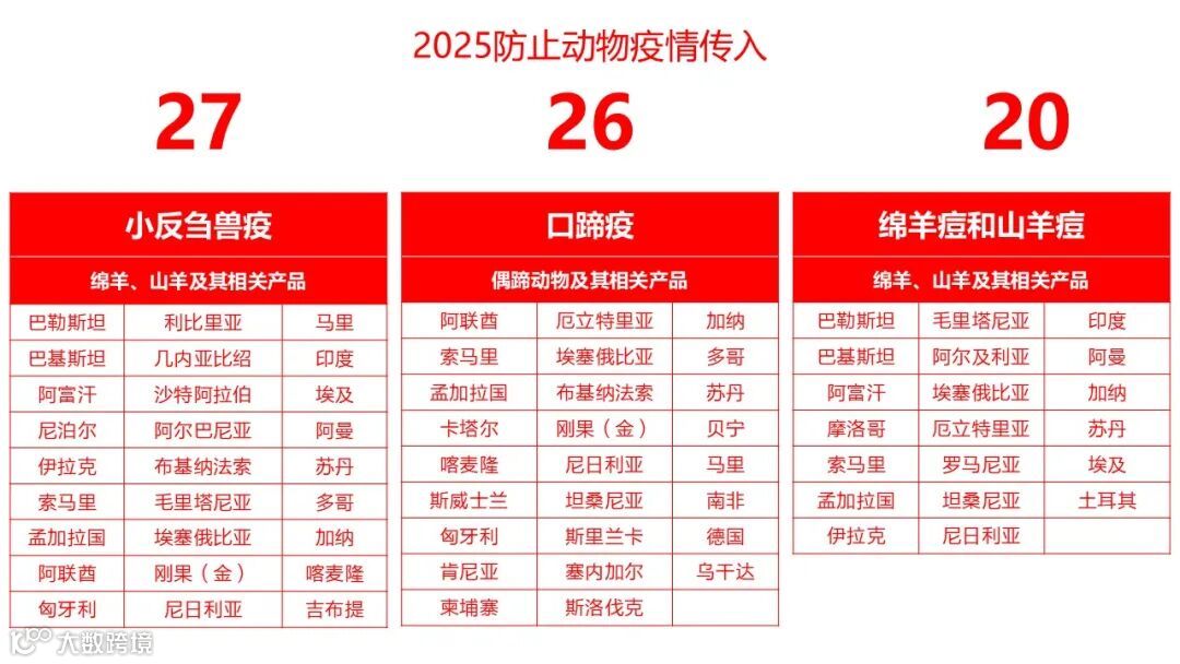 整个2025年,因小反刍兽疫疫情被禁止输入动物产品的国家数,列所有疫情第1位。