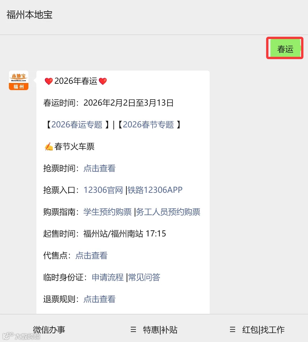 ⭐推荐服务:扫描下方二维码进入【福州本地宝】,在微信对话框回复【春运】也可获取12306APP入口,春运抢票时间表等内容