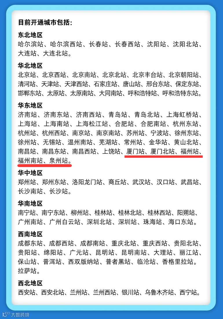 2026年1月15日起,“轻装行”服务试点范围扩大,新增哈尔滨、长春、天津、石家庄、西安、南昌、南宁、乌鲁木齐、拉萨等城市的92个车站,总数达到111个,基本覆盖全国省会城市、直辖市、计划单列市,减轻旅客携带大件行李负担,让乘坐火车出行更轻松。福州站、福州南站2个车站均开通了该服务: