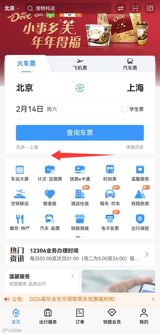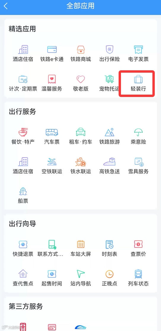 ①进入12306APP,左滑进入全部应用,选择全部应用中的“轻装行”进入预约页面