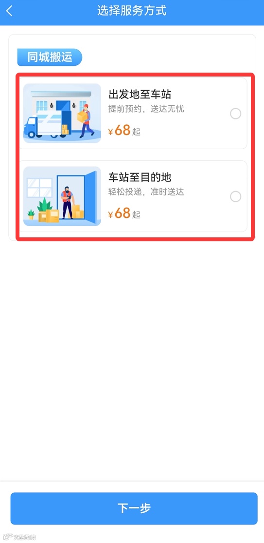 价格为“出发地至车站”和“车站至目的地”68元/件,“出发地至所乘列车站台”和“所乘列车站台至目的地”98元/件