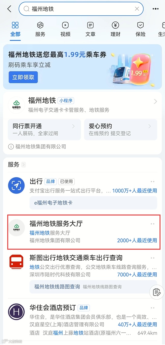 打开支付宝APP,在搜索框输入“福州地铁”,选择“福州地铁服务大厅”