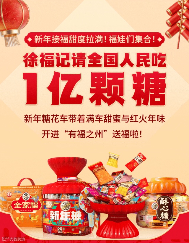 •广度破圈,福运即达:联动京东、美团、朴朴超市、叮咚买菜等平台,看中的徐福记新年糖礼盒,线上下单直接送货到家,甜蜜从街头延续到家门口。