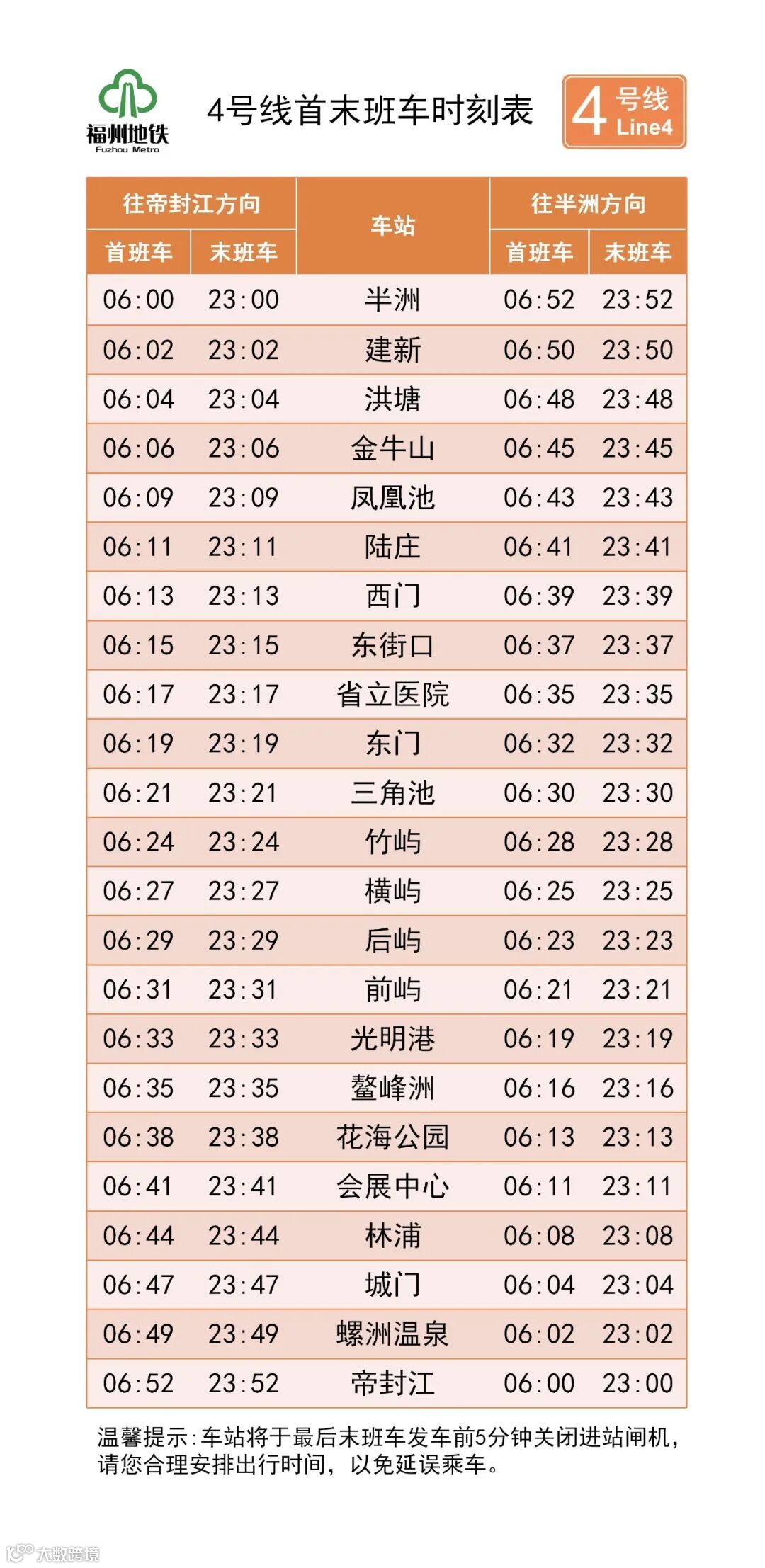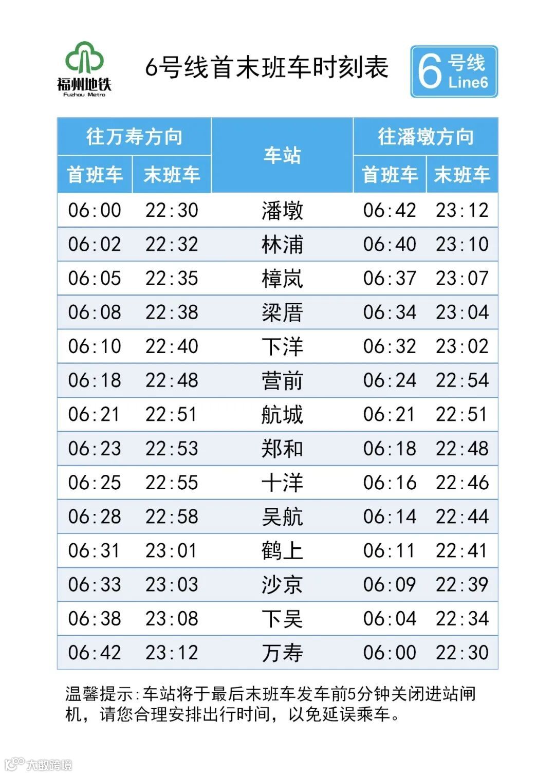 1.各线路具体站点的首末班车时刻,可通过车站公告或通过“福州地铁”官方网站及微信公众号查询。