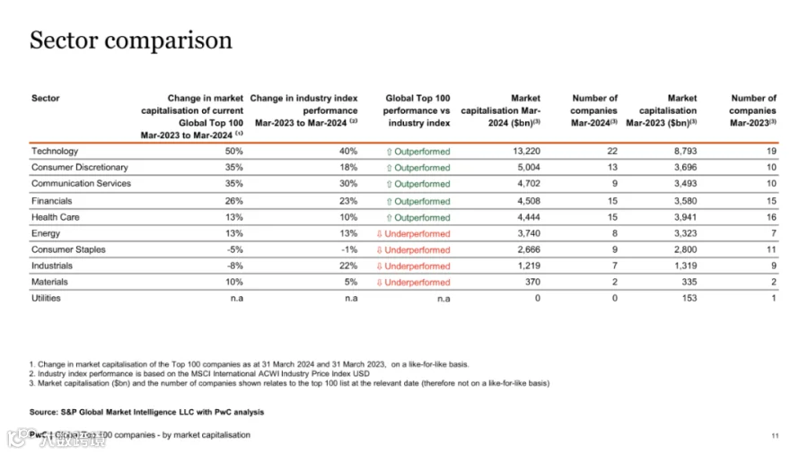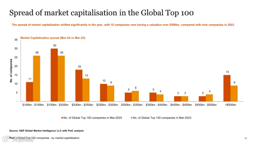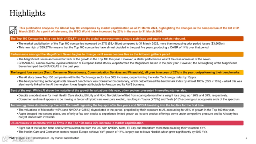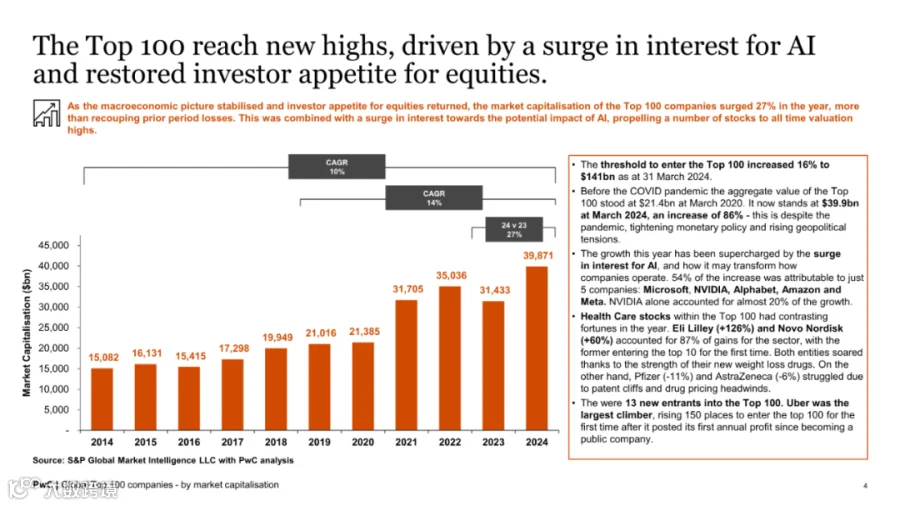 截至2024年3月31日,全球市值100强上市公司总市值达39.87万亿美元,同比增长27%,显著回暖。这一增长主要得益于人工智能技术的迅猛发展以及投资者对股权市场的信心回升。