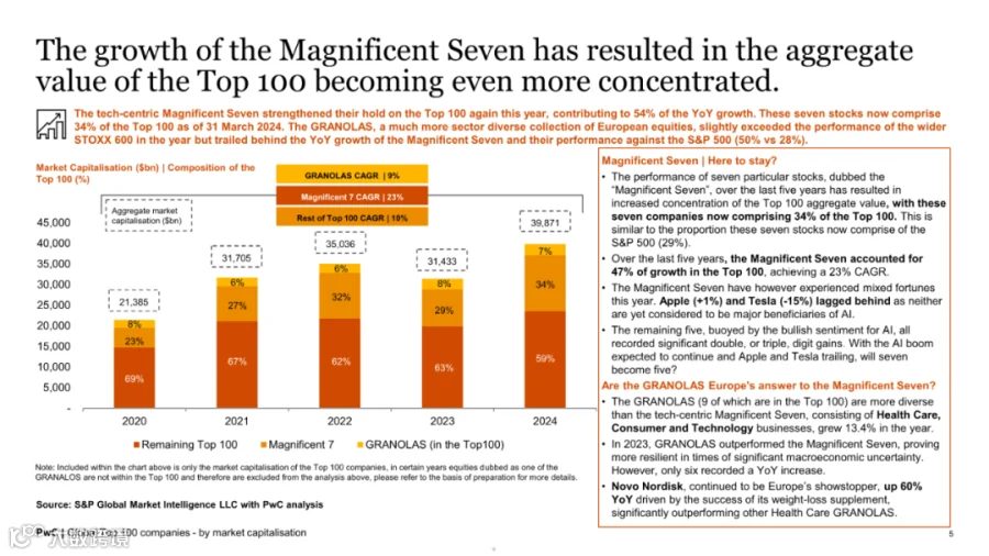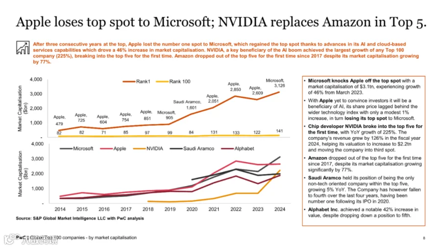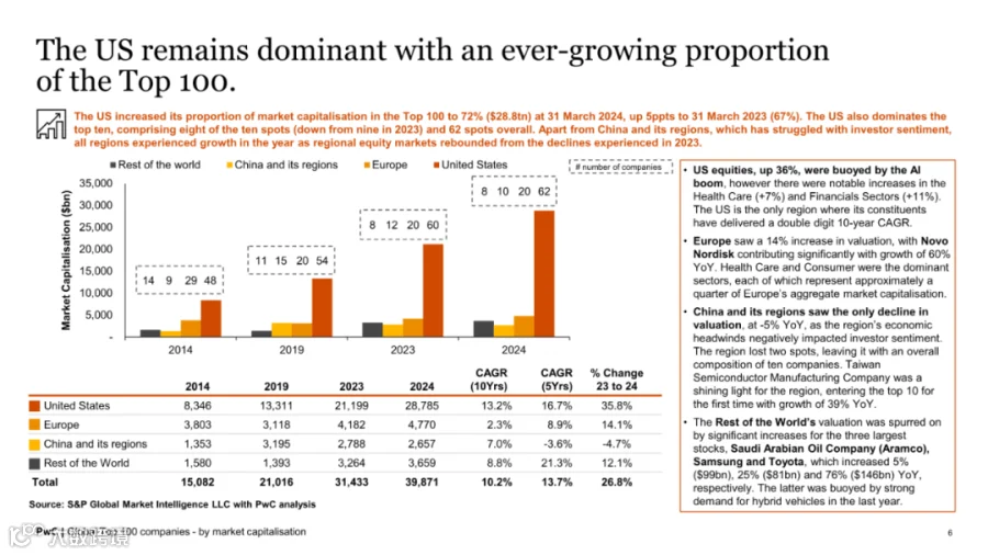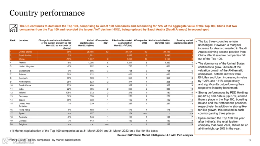 中国地区表现疲软,有两家企业跌出百强榜单,整体市值同比下降15%,成为唯一负增长区域。尽管台积电凭借39%的市值增长首次跻身前十,但中国经济面临的挑战影响了资本市场信心。沙特阿拉伯因沙特阿美市值微增,取代中国位列榜单第二,凸显全球资本格局的动态演变。