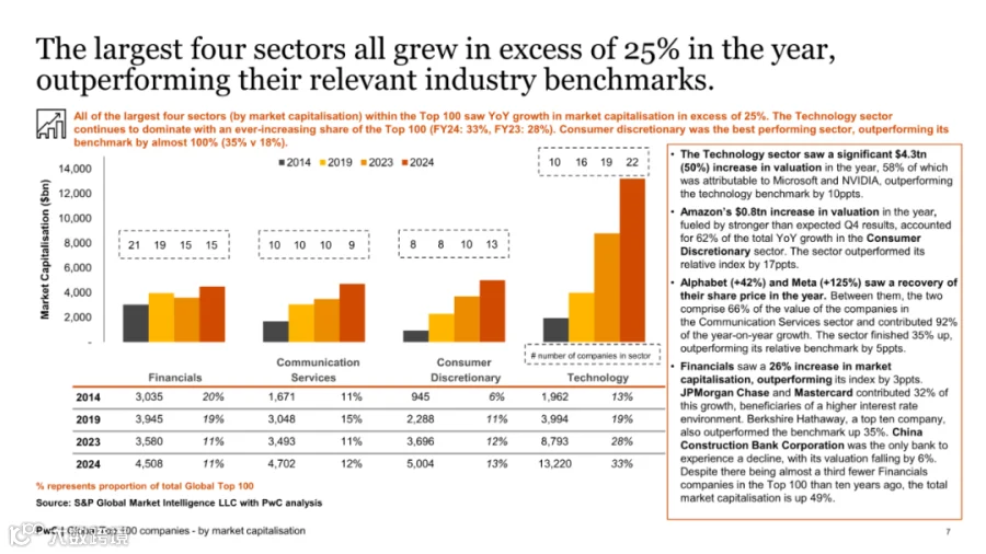 科技、消费、通讯服务和金融四大行业的市值增幅均超25%。科技行业尤为突出,市值占比从2023年的28%提升至2024年的33%,整体估值增长50%。微软与英伟达成该领域增长的主要贡献者,合计贡献58%的增长份额。