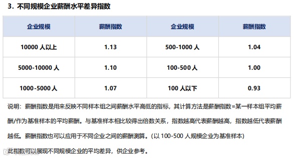 企业规模越大,薪酬水平越高。员工人数超万人的企业薪酬指数达1.13,百人以下企业仅为0.93。