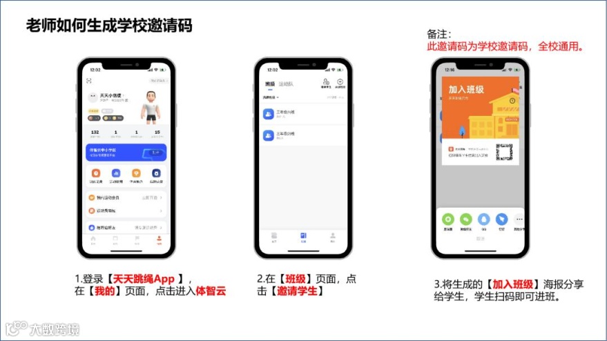 完成认证的老师可在【天天跳绳App】内生成学校邀请码,发送至班级群。学生扫码注册后自动加入班级。操作路径:打开App → 体智云 → 班级 → 点击右上角【邀请学生】生成邀请码。(可参考图片操作)